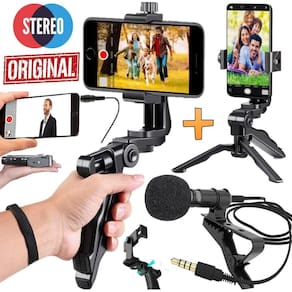 Estabilizador de mão com microfone de lapela, ideal para vlogs, vídeos e videomakers. Permite movimentos suaves, pode ser montado em tripés e utilizado como mini tripé. Possui clipe de silicone para proteger o smartphone e altura ajustável. Microfone de lapela com alta sensibilidade, cabo de 1,5 metros e tampa de espuma protetora.Vendido e entregue por Olist Top
