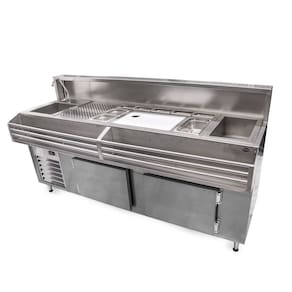 Funcionalidade Versátil: A Estação Bar Refrigerada com Pia oferece diversas funcionalidades em um único espaço, incluindo uma cuba para pia, nichos para cubas gastronômicas, espaço para gelo, placa de corte, pingadeira superior e nicho para garrafas. Isso proporciona um ambiente prático e eficiente para o preparo de bebidas.