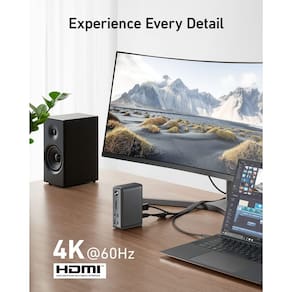 - Grande expansão: equipado com uma porta USB-C de carregamento de laptop de 85 W, uma porta USB-C de entrega de energia de 18 W, uma porta de dados USB-C USB C, 3 portas USB-A, 2 portas HDMI, uma DisplayPort, uma porta Ethernet, slots para cartões SD/microSD, uma porta AUX de 3,5 mm e uma entrada DC.