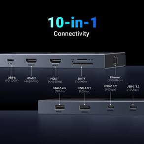 - Estação de ancoragem USB C 10 em 1: inspire mais potencial da porta USB-C do seu laptop com duas portas HDMI, uma porta USB-C PD de 100 W, duas portas USB-C de 10 Gbps, uma USB A 3.0, um leitor de cartão USB A 3.2, RJ45 e SD/Micro SD