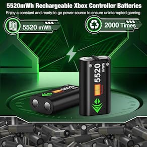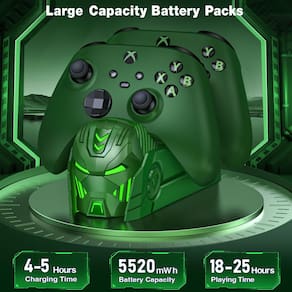 Carregador de controle duplo compatível com controles xbox one e xbox series x/s com baterias de 2 x 5520 mWh e 4 capas de bateria - Potência de alta capacidade: o kit de carregador xbox equipado com duas baterias de 5520 mWh, nossa estação de carregamento de bateria para controle xbox garante uma jogabilidade prolongada sem interrupções. O pacote inclui um carregador para controles Xbox, 2 baterias extras, 1 cabo de carregamento e 4 capas de bateria (2 para xbox one, One, One x e outras 2 para Xbox Series x|s) para sua conveniência - Jogabilidade estendida: com um tempo de carregamento rápido de 4 horas, desfrute de impressionantes 18 a 25 horas de jogos ininterruptos. Recarregável até 2000 vezes, a bateria recarregável para xbox foi projetada para manter você no jogo por muito tempo. Compatível com controles Xbox One, Xbox One S, Xbox One X, Xbox Elite, Xbox Series S e Xbox Series X - Carregamento rápido e proteção avançada: nosso suporte de carregador para controle da série xbox vem com proteção contra sobrecarga, sobrecorrente, superaquecimento e curto-circuito, garantindo a segurança do processo de carregamento. Com um cabo de carregamento USB C, permitindo um tempo de carregamento rápido para recarregar totalmente seus controles remotos Xbox. Sempre tenha dois controles totalmente carregados prontos para outra rodada de jogos - Indicadores LED estéticos e inteligentes: destaque-se com a estética inspirada no capacete robô na frente, adicione um pouco de impulso de super-herói à atmosfera do seu jogo. Mantenha-se informado sobre o status da sua bateria com os indicadores LED da estação de carregamento do controle xbox series x: luz vermelha - carregamento; luz verde totalmente carregada. Um botão na parte superior pode ligar/desligar as luzes LED, o que não afetará o carregamento das baterias - Design conveniente: o compartimento inferior da bateria do carregador xbox é engenhosamente projetado para armazenamento conveniente da bateria, garantindo que você nunca perca as baterias sobressalentes