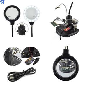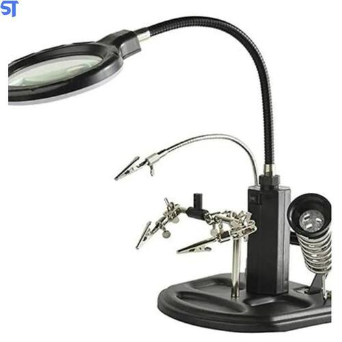 Descrição:Lupa de bancada Profissional e super completa com 16 LED's mais fortes que outros modelos.Aplicações: Laboratórios, eletrônicos, estudantes, cientistas, colecionadores, modelagem, joalheria, consertde relógios e artesanato dentre outrasZoom de ampliação em 2,5x 6D + 4x 12D Alimentação USB ou Pilhas AAAGarras para fixação de placas, objetos e eletrônicosSuporte para ferro de solda100% ajustávelJá acompanha cabo USBIdeal para quem trabalha com eletrônica, conserto de celulares ou que precise de uma visualização mais detalhada e próxima, ao mesmo tempo em que fica com as mãos livres.Especificações técnicas:Zoom de ampliação em 2,5x 6D + 4x 12D Tamanho da lupa: 82mm + 21mm diâmetro Comprimento da haste lupa : 265mmComprimento da haste garra jacaré : 290mmAlimentação: USB ou 4 pilhas AAItens Inclusos1 Lupa para bases1 Cabo USB