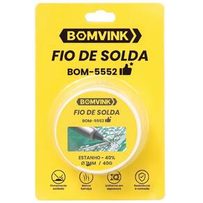 Produto: Estanho em fio para solda espessura de 1 mm 40 g - BOM-5552 Marca: Bomvink Descrição: O Estanho em fio para solda espessura de 1 mm 40 g BOM-5552 da Bomvink é ideal para soldagens de alta qualidade e eficiência. Este produto excepcional combina características avançadas com facilidade de uso, garantindo juntas de solda impecáveis e resistência duradoura em todos os seus projetos eletrônicos e elétricos. Com estrutura composta por 40% de estanho, o fio de solda BOM-5552 inclui breu e fluxo integrados, reduzindo significativamente a emissão de fumaça e a incidência de respingos durante o uso. Além disso, o baixo ponto de fusão facilita uma soldagem rápida e segura, minimizando potenciais danos a componentes delicados. Características: • Juntas de Solda Suaves e Arredondadas: Garante acabamentos mais limpos e profissionais, assegurando forte aderência e longevidade;• Menos Fumaça e Respingos: O uso integrado de breu e fluxo no fio diminui a poluição do ar e oferece um ambiente de trabalho mais limpo e seguro;• Uniformidade em Espessura: A consistência do fio promove aplicações precisas e resultados uniformes em todas as soldagens;• Baixo Ponto de Fusão: Facilita a aplicação rápida, ideal para trabalhos que exigem agilidade e eficácia, reduzindo o risco de danos;• Resistência à Corrosão: Aumenta a durabilidade das juntas soldadas, especialmente em condições ambientais adversas.Especificações: Diâmetro do fio de estanho: 1 mmPercentual de estanho: 40%. Marca: Não Informado