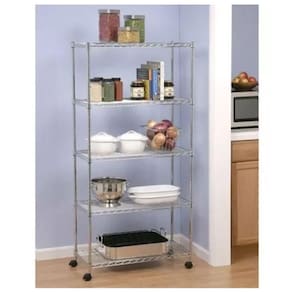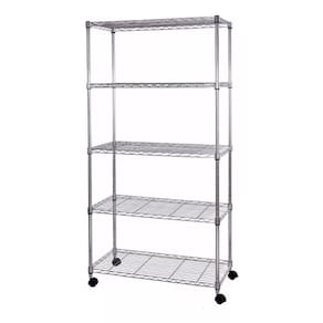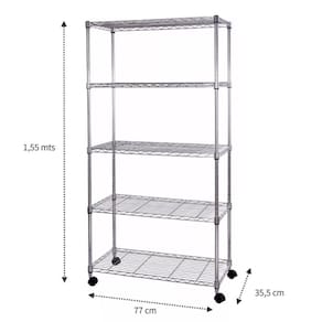 ESTANTE ORGANIZADORA, COM PRATELEIRAS DO TIPO COMERCIAL ARAMADA. MODELO COM 5 PRATELEIRAS COM RODÍZIO.