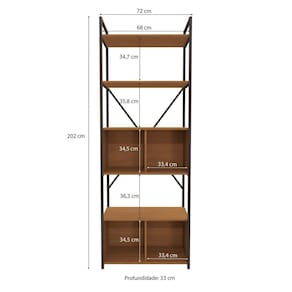 Organização e otimização com a Estante Alta com Portas LI018 da Linha Industrial Kappesberg. Medindo 2,02m de altura, 72cm de largura e 33cm de profundidade, combina desde a sala de estar, o quarto, escritório, área de lazer e até a garagem. Sua estrutura metálica é resistente, e pintada com tinta epóxi na cor preto fosco, garante maior durabilidade contra a umidade e um acabamento lindo. Os nichos, portas e prateleiras, em MDP de 15cm e acabamento touch na cor canela, com a textura dos veios da madeira, garantem amplo espaço para organizar livros, documentos, plantas, roupas, decorações e outros objetos. Seu reforço em X nas costas garante mais resistência, além de ser fácil de montar e ajustável em todos os pisos com as sapatas reguláveis. Produto Montado: Sim Acabamento da Porta: Pintura UV Acabamento da Prateleira: Pintura UV Acabamento dos Pés: Pintura Altura dos Pés: 0,1 cm Altura Máxima dos Pés: 0.1000 codigo_ean: 7900288245533 Complexidade da Montagem: Média: pode ser montado por mais de uma pessoa e/ou necessite de maior conhecimento para montagem Cor: Canela/Preto Fosco Cor do Produto: Canela/Preto Fosco Escala de Brilho: Fosco Escala de Brilho da Porta: Fosco Escala de Brilho da Prateleira: Fosco Itens Inclusos: 1 Estante, Manual de Montagem e Kit Ferragens Linha ou Coleção: Industrial Manual de Montagem e Instalação: https://product-hub-prd.madeiramadeira.com.br/479646823/documents/5089b133-2296-491d-802c-46cfd571f0f13243774544517591462751527.pdf Marca: Kappesberg Material da Porta: MDP Material da Prateleira: MDP Material do Puxador da Porta: Metal Material dos Pés: Polipropileno Material Principal: Aço Necessita Montagem: Sim Origem do Produto: Nacional Peso: 33,8691 kg Peso Máximo por Prateleira: 7 kg Possui Acabamento na Parte de Trás: Sim Possui iluminação: Não Possui Pés: 04 Possui Portas: Sim Possui Prateleiras: Sim Possui Rodízio: Não Quantidade de Nichos: 04 Recomendações de Uso, Manutenção e Limpeza: Limpeza com pano macio levemente umedecido. Não utilizar produtos abrasivos. Sapatas Niveladoras: Não Sistema de Montagem: Parafuso Philips Suporta Até (kg): 30 kg Tipo de Dobradiça/Corrediça da Porta: Metálica Tipo de Puxador da Porta: Externo