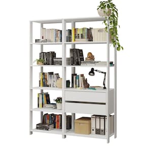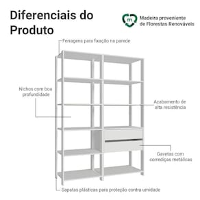 Com prateleiras bem distribuídas e duas gavetas espaçosas, o conjunto oferece espaço para livros, pastas, documentos, caixas organizadoras e itens decorativos. É perfeito para deixar tudo visível e acessível no dia a dia.