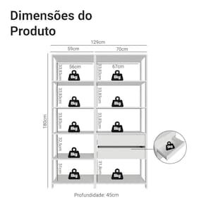 Cor: Branco | Garantia: 3 meses contra de fabricação | Dimensões - Altura: 180 cm | Dimensões - Largura: 129 cm | Dimensões - Profundidade: 45 cm | Produto (produto): Estante Multiuso | Marca: Madesa | Peso aproximado: 48 kg | Material: MDP | Estado de Origem: RS | Conteúdo da embalagem: Uma Estante Multiuso | Material para Filtro: MDP | Instruções/Cuidados: Utilize um pano limpo, levemente umedecido e seque em seguida a superfície. Não usar produtos químicos ou abrasivos para a limpeza. Recomendamos polir seu móvel com lustra-móveis duas a três vezes por ano. | Produto precisa de Montagem?: Sim | Peso Produto Com Embalagem (Kg): 48,10 | Altura do Produto com Embalagem (cm): 39 | Largura Produto Com Embalagem (cm): 46,1 | Comprimento Produto Com Embalagem (cm): 185,8 | Descrição do Tamanho: 180 cm x 129 cm x 45 cm | Nome do Simples no Fornecedor: Estante Armário Multiuso para Escritório 129cm 9 Prateleiras 2 Gavetas Branco Madesa | Fabricante: Madesa | RBN: Casa/Móveis/Móveis para Escritório em Casa | Materiais do corpo: MDP | Quantidade de caixas de embalagem: 4 | Bullet Point 1: Dimensões: 180 cm altura x 129 cm largura x 45 cm profundidade | Bullet Point 2: A Estante Multiuso para Livros Madesa é um móvel versátil e elegante para tornar seu ambiente mais funcional e agradável | Bullet Point 3: Ela oferece espaço de sobra para acomodar livros, documentos, itens decorativos | Bullet Point 4: Possui acabamento de alta resistência, conservando a beleza do móvel por muito mais tempo. | É Frágil: Não | Quantidade de Itens: 1 | Certificação de teste externa: Sim | Precisa de baterias ou pilhas: Não | da peça (part_number): MDFC02003109 | Peso do item (item_weight): value=48.1;unit=kilograms | Dimensões do item P x L x A (item_depth_width_height): depth#value=45;depth#unit=centimeters;height#value=180;height#unit=centimeters;width#value=129;width#unit=centimeters | Exige montagem (is_assembly_required): Sim | Requer montagem (REQUIRES_ASSEMBLY): Sim | Inclui manual de montagem (INCLUDES_ASSEMBLY_MANUAL): Sim | do modelo (model_number): MDFC02003109 | is_assembly_required: Sim | Componentes incluídos: Ferragens | Cor: Branco