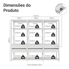 - Três Estantes Multiuso de 70 cm de largura com quatro prateleiras e duas gavetas em cada