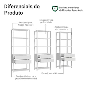 Além disso, o móvel possui um acabamento branco de alta resistência, pés com sapatas plásticas que oferecem proteção contra a umidade e ferragens inclusas para fixação na parede, assegurando maior estabilidade e segurança.