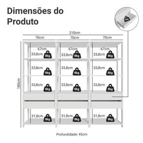 - Três Estantes Multiuso de 70 cm de largura com quatro prateleiras e duas gavetas em cada