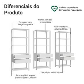 Além disso, o móvel possui um acabamento branco de alta resistência, pés com sapatas plásticas que oferecem proteção contra a umidade e ferragens inclusas para fixação na parede, assegurando maior estabilidade e segurança.
