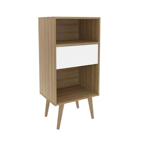 Possui um nicho aberto e uma gaveta para guardar objetos, livros ou itens decorativos, além de pés cônicos em madeira de eucalipto que garantem leveza ao design.