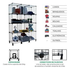 ESTANTE BALCÃO EXPOSITOR ARAMADO 24 NICHOS HORIZONTAL PRETOEstante super resistente, ideal para organização de diversos ambientes como loja, garagem, quartos, lavanderia ou despensa de sua casa, mantendo praticidade e facilidade de acesso aos produtos de maneira organizada e limpa.Confeccionada em aço resistente, possui um excelente acabamento com design moderno e pintura especial eletrostática.Pode ser utilizada em lojas, como balcão ou prateleiras para os produtos.DIMENSÕES APROXIMADAS: - Altura: 125 cm - Largura: 180 cm - Profundidade: 30 cmATENÇÃO: - Monte o seu produto de acordo com a foto do anúncio, caso tente montar de alguma outra maneira diferente, não terá as peças corretas ou suficientes.CARACTERÍSTICAS: - Cor: Preto - Material: Aço - Tela aramada com malha de espaços de 5 cm - Medidas do Nicho: 30 x 30 x 30 cm. - Distância do Chão: 5cm* Até 03 ou 04 nichos de altura, é excelente para uso como balcões, acima disso, pode ser utilizada como estantes/prateleiras para produtos, estoque, garagem, área de serviço, etc. ITENS INCLUSOS: - Kit de telas e conectivos para montagem de 01 unidade de estante aramada.----------------------- Envio rápido em até 24 horas úteis após confirmação da compra- Compra garantida e 100% segura- O melhor atendimento antes e depois da sua compra- Produtos de qualidade- Entre em contato e teremos a satisfação em melhor atendê-lo----------------------OBSERVAÇÕES: - Imagens ilustrativas - Não nos responsabilizamos pelo uso inadequado do produto - O produto vai desmontado para ser montado no local e igual a imagem do anúncio;Não deixe de conhecer nossos outros produtos! Marca: IGUANNA