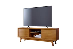 O modelo se destaca pelas portas deslizantes, que garantem acesso fácil aos compartimentos internos, além de manter o visual limpo. A base e o tampo com detalhe chanfrado agregam sofisticação ao móvel, enquanto os pés usinados conferem um toque de originalidade ao design.