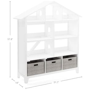 A estante casa de bonecas Martha Stewart Kids Deluxe Dollhouse Bookcase em Linen White foi desenvolvida para combinar armazenamento de livros e brinquedos com um formato lúdico de casa de bonecas em escala infantil. A estrutura em madeira de bétula e madeira engenheirada possui telhado inclinado, recortes de portas e janelas e escada removível, permitindo usar os compartimentos tanto como prateleiras quanto como “cômodos” para brincadeiras com bonecas de até aproximadamente 40cm de altura.?