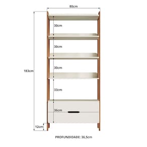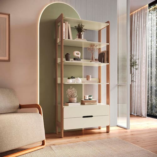 Leveza, funcionalidade e um design que se adapta a qualquer ambiente. A Estante Elvis é o equilíbrio perfeito entre praticidade e estética, oferecendo quatro prateleiras amplas para expor livros, plantas e objetos decorativos, além de duas gavetas inferiores para manter tudo organizado. Seus cantos arredondados trazem um toque suave e moderno, enquanto sua estrutura robusta, produzida 100% em MDF de 1,5cm com acabamento BP, garante resistência e durabilidade. Fácil de limpar e de montar, ela se encaixa perfeitamente em salas, escritórios, quartos e até mesmo cozinhas, tornando qualquer espaço mais elegante e bem aproveitado. Produto Montado: Sim Acabamento da Gaveta: Melamínico Acabamento da Prateleira: Melamínico Acabamento dos Pés: Melamínico Altura dos Pés: 12 cm Altura Máxima dos Pés: 12.0000 Ambiente Principal: Sala de Estar codigo_ean: 7901008601219 Complexidade da Montagem: Média: pode ser montado por mais de uma pessoa e/ou necessite de maior conhecimento para montagem Cor: Off White/ Castanho Cor do Produto: Off White/ Castanho Cor Flex: Não Cor Interna: Branco Escala de Brilho: Fosco Escala de Brilho da Gaveta: Fosco Escala de Brilho da Prateleira: Fosco Gaveta com Chave: Não Itens Inclusos: 1 Estante, Kit Ferragens e Manual de Montagem Linha ou Coleção: Elvis Manual de Montagem e Instalação: https://product-hub-prd.madeiramadeira.com.br/979234019/documents/8f250771-915e-47ca-a9c1-4bec5b374124494dbb9dac813652e487981441.pdf Marca: FD Material da Gaveta: MDF Material da Prateleira: MDF Material dos Pés: MDF Material Principal: MDF Montagem Flex: Não Necessita Montagem: Sim Origem do Produto: Nacional Peso: 40,3 kg Peso Máximo por Gaveta: 5 kg Peso Máximo por Prateleira: 6 kg Possui Acabamento na Parte de Trás: Não Possui Espelho: Não Possui iluminação: Não Possui Pés: 04 Possui Portas: Não Possui Prateleiras: Sim Possui Rodízio: Não Possui Vidro: Não Quantidade de Gavetas: 02 Gavetas Recomendações de Uso, Manutenção e Limpeza: Limpar somente com um pano levemente umedecido. Indicado para ambientes internos Sapatas Niveladoras: Não Sistema de Montagem: Parafusos, cavilhas e minifix Suporta Até (kg): 34 kg Tipo de Corrediça da Gaveta: Metálica Telescópica Tipo de Puxador da Gaveta: Embutido