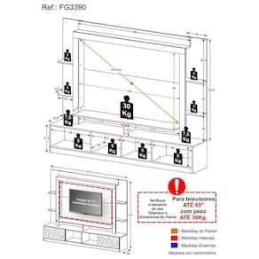 Dimensões do produto montado: Altura: 171cm | Largura: 213cm | Profundidade: 38cm Painel - Altura: 98cm | Largura: 150cm *Devido as variações de tamanho dos televisores no mercado, sugerimos que verifique as medidas da sua TV e compare com o painel antes de efetuar a compra. *Você pode consultar as medidas internas na imagem técnica do produto.