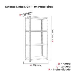 Uma estante com estrutura de aço é uma opção moderna e durável para organizar seus pertences. O aço confere resistência e estabilidade, tornando-a ideal para armazenar livros, objetos decorativos, materiais de escritório e muito mais. Além disso, a estética do aço pode dar um toque contemporâneo ao ambiente. A versatilidade desse material permite que a estante se encaixe em diversos estilos de decoração, do industrial ao minimalista. Acabamento da Prateleira: Pintura Complexidade da Montagem: Baixa: pode ser montado por uma pessoa sozinha Cor: Cinza Cor do Produto: Cinza Cor Interna: Cinza Escala de Brilho: Semi-Fosco Escala de Brilho da Prateleira: Semi-Fosco Itens Inclusos: uma estante Manual de Montagem e Instalação: https://product-hub-prd.madeiramadeira.com.br/901829/documents/bf053184-ee38-4665-acc6-7468cdab0062438Estante2020Linha20Light.pdf Material da Prateleira: Aço Material dos Pés: Polipropileno Material Principal: Aço Necessita Montagem: Sim Origem do Produto: Nacional Peso: 6,0563 kg Peso Máximo por Prateleira: 15 kg Possui Espelho: Não Possui Possui iluminação: Não Possui Pés: 04 Possui Portas: Não Possui Prateleiras: 04 Possui Rodízio: Não Recomendações de Uso, Manutenção e Limpeza: Limpeza deve ser feita com um pano levemente umedecido e um pano seco. Sapatas Niveladoras: Não Sistema de Montagem: Parafuso Suporta Até (kg): 15 kg