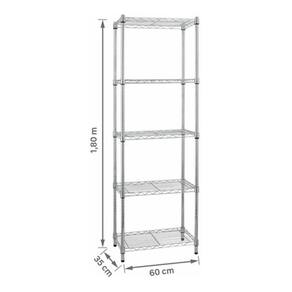 O produto contém 5 prateleiras com capacidade de 20kg cada uma. Não possui portas, gavetas nem rodas. Mede 180 cm de altura, 60 cm de largura e 35 cm de profundidade. Vem com 4 pés de metal.
