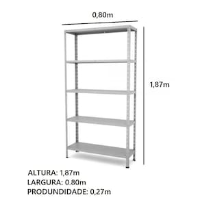 **Características** A estante Amapá em aço possui 187 cm 5 prateleiras reguláveis com 27 cm de profundidade e 80 cm de largura.