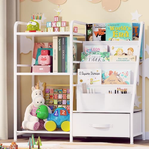 Armazenamento de brinquedos e livros charmosos e funcionais para crianças. Esta estante infantil multifuncional e unidade de armazenamento de brinquedos foi projetada para trazer organização e alegria ao quarto de qualquer criança. Com uma linda caixa de tecido e compartimentos de armazenamento versáteis, esta unidade combina um suporte de livros para crianças e organizador de brinquedos em um. O design dois em um é ideal para manter livros de histórias, brinquedos de pelúcia e material escolar de maneira limpa e acessível, tornando-a uma adição prática a qualquer estante infantil com configuração de armazenamento. Amplo armazenamento com caixas móveis e prateleiras O lado esquerdo possui uma prateleira de exibição de grande capacidade, completa com duas caixas de tecido removíveis na parte inferior que podem ser usadas para brinquedos maiores ou itens utilizados com frequência. Este armazenamento de brinquedos e livros para crianças é perfeito para organização flexível, permitindo que as crianças gerenciem seus pertences de forma independente. As caixas de armazenamento inferiores podem ser usadas como organizadores independentes, adicionando versatilidade a esta estante para quarto de crianças. Armazenamento dedicado para livros e suprimentos O lado direito possui um sistema de prateleiras de tecido de quatro camadas, projetado especificamente para guardar livros, ferramentas de desenho e outros itens essenciais. Dois bolsos pequenos fornecem espaço extra para armazenar itens menores, como giz de cera e réguas, garantindo um espaço organizado e organizado. Esta estante infantil não é apenas prática, mas também uma ótima maneira de incentivar as crianças a se envolverem em atividades de leitura e criativas. Estrutura segura e resistente. Construída com prateleiras reforçadas, esta estante de bebê para berçário foi projetada para lidar com o uso diário enquanto prioriza a segurança. As bordas arredondadas e o design do arco adicionam uma camada extra de segurança, tornando-a uma escolha confiável para crianças pequenas e pequenas. É uma solução cuidadosa e segura para pais que procuram uma estante infantil que combine durabilidade e estilo. Ideal para vários espaços. Adequada para uma variedade de ambientes, do quarto à sala de jogos, esta estante de chão para crianças se encaixa perfeitamente em qualquer layout de cômodo. É perfeita para creches, creches ou salas de estar, oferecendo um espaço charmoso e organizado para as crianças explorarem sua criatividade e desenvolverem bons hábitos organizacionais. Esta solução de armazenamento de brinquedos de berçário facilita manter tudo no lugar, promovendo um ambiente livre de bagunça para brincar e aprender. Especificações do produto: Dimensões da embalagem: 44,5 cm (L) x 18,5 cm (A) x 32 cm (P) Material: Estrutura de metal resistente - [Estante infantil multifuncional e armazenamento de brinquedos] Esta encantadora estante infantil e unidade de armazenamento de brinquedos combina funcionalidade com estilo, apresentando um suporte de exibição de grande capacidade para livros e brinquedos. O lado direito inclui prateleiras de armazenamento de tecido de quatro camadas, perfeitas para organizar livros, ferramentas de desenho e pequenos itens, tornando-a uma prateleira de livros prática para crianças e ideal para manter os quartos limpos e arrumados - Design adorável e adequado para crianças] Com um design divertido de desenho animado nas caixas de armazenamento, este organizador infantil de prateleira de livros adiciona um toque de cor e diversão a qualquer espaço. A combinação de cores vibrantes e estrutura robusta a torna uma adição atraente e durável a qualquer configuração de estante de berçário, adequada para quartos, salas de jogos ou berçários - Armazenamento de brinquedos espaçoso e móvel: o lado esquerdo inclui uma prateleira de exibição de grande capacidade com dois compartimentos de tecido móveis na parte inferior, permitindo a organização flexível de brinquedos e itens maiores. Esta unidade de armazenamento de livros infantis também inclui uma gaveta de tecido resistente, tornando-a uma escolha versátil para móveis de quarto de criança ou como estante de livros para berçário - Estrutura segura e durável: construída com prateleiras reforçadas e lingas duráveis, esta prateleira de livros para bebês foi projetada para suportar o uso diário. Os cantos arredondados e a moldura estável aumentam a segurança, tornando-a ideal para crianças pequenas usarem de forma independente, proporcionando funcionalidade e tranquilidade para os pais - [Perfeita para vários espaços] Esta capa de livro para quarto de crianças é ideal para uso em vários ambientes, de quartos a salas de jogos e até mesmo salas de aula ou creches. Seu design flexível e elegante se encaixa perfeitamente em qualquer ambiente, oferecendo amplo armazenamento para livros, brinquedos e muito mais, tornando-a uma solução prática para estantes de livros, armários e prateleiras infantis