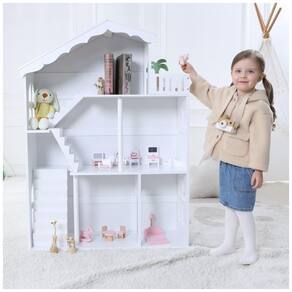 Esta estante de casa de bonecas de madeira branca é perfeita para o quarto da criança, sala de jogos, sala de estudo e outros locais. Com um design de casa de bonecas, a estante pode acomodar uma variedade de pequenos móveis, permitindo que as crianças leiam livros ou brinquem de faz de conta com suas bonecas ao mesmo tempo.