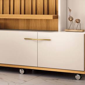 A Estante de TV 60 Pol 200 cm Sam Cinamomo/Off White é uma excelente escolha para quem deseja um móvel com qualidade, funcionalidade e estilo na Sala de Estar. Além de organizar objetos decorativos, ela contribui para a harmonia do ambiente. Seu design marcante apresenta uma autenticidade em ripado com larguras intercaladas, adicionando um toque de sofisticação. Além disso, possui quatro portas com dobradiças laterais e elegantes, puxadores metálicos em tom dourado, conforto, praticidade e espaço para organizar. O nicho lateral, equipado com prateleiras de vidro de 6mm, é perfeito para exibir itens decorativos ou eletrônicos, agregando charme e função. A iluminação LED embutida realça o painel, fornece uma iluminação suave que cria um ambiente aconchegante. Também conta com rodízios cromados de 50mm, que garantem fácil movimento e praticidade. O móvel é fabricado em MDP e MDF, proporcionando alta resistência e durabilidade. O acabamento conta com pintura UV, que protege a superfície contra riscos e desgastes. Gostou? Então garanta a sua agora e transforme seu ambiente com elegância, qualidade e funcionalidade!