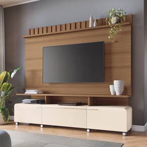 A Estante de TV 70 Pol 200 cm Ripado Jane Castanho/Off White é a escolha ideal para compor sua sala de estar, trazendo beleza e exclusividade. Ela foi produzida em MDP e MDF de 25mm e 15mm, materiais de alta qualidade e ecologicamente corretos. Além de um design moderno e funcional a estante conta com; um painel para TV que suporta até 50 polegadas, a estante apresenta tampo e a prateleira superior com espessura de 25mm garantindo maior resistência e durabilidade ao produto, o detalhe ripado na frente é um charme à parte. Possui portas laterais basculantes com dobradiças metálicas e pistão a gás, que abrem e fecham suavemente proporcionando uma flexibilidade silenciosa. Conta também com gaveta central com corrediças telescópicas, que facilitam a abertura e o fechamento e puxadores metálicos em tom dourado conferindo um toque de sofisticação ao móvel. Seus rodízios cromados de 50mm facilitam tanto a movimentação quanto a limpeza. Esta estante foi pensada para o seu lar. Aproveite!