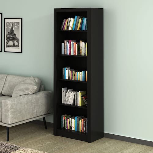 CARACTERÍSTICAS TÉCNICAS: - Estante para escritório ME4104, com 5 prateleiras espaçosas, projetadas para armazenar livros, arquivos e objetos pessoais; - Fabricada em MDP com acabamento em BP na Cor Preto, proporcionando resistência e durabilidade ao móvel; - Produto entregue desmontado, novo, acompanhado de manual de montagem e ferragens; - Peso Suportado: 12 kg por prateleira.