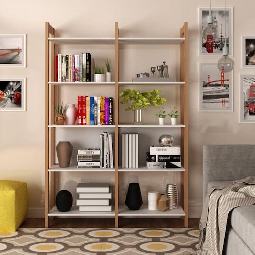 Estante Haia. Estrutura em MDP e acabamento em pintura UV e parte em BP. Imagem meramente ilustrativa. A decoração do ambiente não acompanha o produto, produto entregue desmontado, novo, acompanha nota e manual de montagem e ferragem. Acabamento da Prateleira: Pintura UV Ambiente Principal: Sala de Estar Complexidade da Montagem: Média: pode ser montado por mais de uma pessoa e/ou necessite de maior conhecimento para montagem Cor: Amêndoa/Branco Cor do Produto: Amêndoa/Branco Cor Flex: Amêndoa/Branco Cor Interna: Amêndoa/Branco Escala de Brilho: Semi-Brilho Escala de Brilho da Prateleira: Semi-Brilho Itens Inclusos: Kit Ferragem e Manual de Montagem. Linha ou Coleção: AZ Manual de Montagem e Instalação: https://cdn2.madeiramadeira.com.br/atributo/tecno-mobili/1275068-az-2023-yescasa.pdf Material da Prateleira: MDP Material Principal: MDP Necessita Montagem: Sim Origem do Produto: Nacional Peso: 37,3 kg Peso Máximo por Prateleira: 5 kg Possui Espelho: Não Possui Possui iluminação: Não Possui Pés: Não Possui Portas: Não Possui Prateleiras: 10 Possui Vidro: Não Recomendações de Uso, Manutenção e Limpeza: Para uma limpeza mais efetiva, utilizar apenas pano macio umedecido e sabão neutro. Não utilizar produtos abrasivos. Sistema de Montagem: Parafuso. Suporta Até (kg): 50 kg