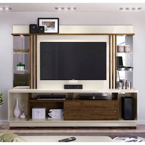 A Estante Home Gisele, com certeza será uma das melhres compras que você irá fazer! Aqui vou apresentar alguns detalhes dessa perfeição. Começando pelas portas, super modernas, ripadas que se sobrepõe, podendo formar um novo design para o ambiente. Tem espelhos laterais com iluminação em LED, prateleiras em vidro, e suporta uma TV de até 55 polegadas. O material de fabricação é MDP. Esse modelo é finalizado com os pés comuns, super discretos. Aproveite, compre já.