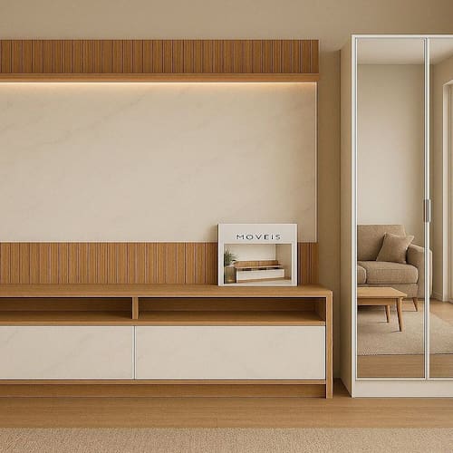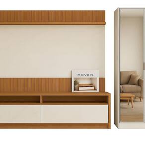 Juntos, formam um ambiente harmonioso, arejado e moderno com presença marcante e alta utilidade. Produto Montado: Sim Acabamento: Finish Foil Acabamento da Porta: Finish Foil Acabamento da Prateleira: Finish Foil Acompanha Lâmpada: 01 Acompanha Manual de Instalação: Sim Altura do Conjunto: 180 cm Altura do Espelho 01: 167 cm Altura do Espelho 02: 167 cm Altura do Painel: 124 cm Altura do Rack: 56 cm Ambiente Principal: Sala de Estar codigo_ean: 7900288206534 Complexidade da Montagem: Baixa: pode ser montado por uma pessoa sozinha Cor: Freijó Ripado / Branco Cor do Produto: Freijó Ripado / Branco Cor Interna: Branco Escala de Brilho: Semi-Fosco Escala de Brilho da Porta: Semi-Fosco Escala de Brilho da Prateleira: Semi-Fosco Espessura do Espelho: 3 mm Espessura do Painel: 15 cm Espessura do Tampo: 15 mm Fita Integrada: Sim Fixação na Parede: Sim Formato do Espelho: Retangular Ideal para TVs até (Polegadas): 70 Itens Inclusos: 1 Rack, 1 Painel, 1 Armário, Kit Ferragens e Manual de Montagem. Largura do Conjunto: 180 cm Largura do Espelho 01: 27 cm Largura do Espelho 02: 27 cm Largura do Painel: 180 cm Largura do Rack: 180 cm Linha ou Coleção: Rio Manual de Especificação Técnica: https://product-hub-prd.madeiramadeira.com.br/730741661/documents/5fb44b00-3182-49e9-8854-0920d04f3c269d929598966124174844884363.pdf Manual de Montagem e Instalação: https://product-hub-prd.madeiramadeira.com.br/730741661/documents/e24fd557-a5d1-4f5f-9be1-e7001605937ff2959895612417484488402822.pdf Marca: Móveis Menezes Material da Porta: MDP Material da Prateleira: MDP Material Principal: MDP Montagem Flex: Sim, Pode ser montado rack e painel separados. Necessita Montagem: Sim Origem do Produto: Nacional Peso do Painel: 15 kg Peso do Rack: 25 kg Peso Máximo por Prateleira: 5 kg Possui Adega: Não Possui Espelho: Sim Possui iluminação: Sim Possui Passa Cabos: Não Possui Pés: Não Possui Portas: Sim Possui Prateleiras: Sim Possui Tomada: Não Possui Vidro: Não Profundidade do Conjunto: 38 cm Profundidade do Painel: 15.0000 Profundidade do Rack: 38 cm Quantidade de Espelho: 02 Espelhos com Tamanhos Diferentes Quantidade de Nichos: 02 Recomendações de Uso, Manutenção e Limpeza: Não molhar, usar pano seco para limpeza. Sistema de Montagem: manual Suporte de TV Universal Incluso: Não Tipo de Dobradiça/Corrediça da Porta: Metálica Tipo de Fixação do Espelho: Fita Dupla Face Tipo de Puxador da Porta: Externo Marca: Não Informado