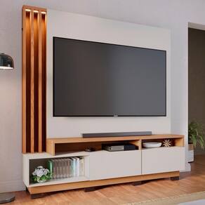 Estante Home Para TV 75 Polegadas Humaita, um móvel para quem deseja ter um verdadeiro cinema em casa, unindo elementos do design minimalista e contemporâneo, ideal para qualquer decoração. Estrutura MDP de 15 mm e 25 mm, proporcionando resistência à peça e mais durabilidade, contando com pintura em acabamento UV (Fosco). Composto por amplo painel, que conta detalhes de ripados decorativos em sua lateral, iluminados por uma canaleta de led (bivolt) que proporcionam uma ambientação sofisticada e aconchegante, bancada com amplo tampo que suporta até 10 kg distribuídos, possibilitando a disposição de decorações, 2 portas basculantes com sistema abre e fecha com pistão a gás e dobradiças metálicas, ideal para organização de aparelhos eletrônicos e demais objetos, possui 3 nichos, furação para passagem de cabos, e opção de com 8 pés de plástico. Painel suporta até 40 kg distribuídos, é ideal para TV de até 75 polegadas. Uma ótima opção para quem busca por um ambiente espaçoso e cheio de personalidade. Este móvel chegará na sua casa separado em 02 volumes.