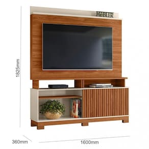 Características: Painel montagem flex Estrutura em MDF/MDP Tampos de 25mm 1 porta de correr Trilho de alumínio Porta ripada em MDF revestido Suporta TVs de até 65 polegadas