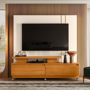 Características: 2 Gavetas grandes 1 Prateleira Corrediças telescópicas Estrutura em MDP Possui rodízios Painéis em MDP de 15 e 40mm Perfis com acabamento em Hot Stamping Peso total suportado 65 kg Pintura através do método DIP Sistema de fixação Girofix Suporte para TV de até 75 polegadas