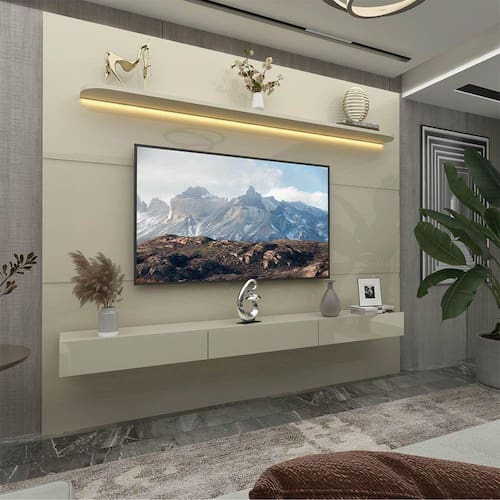 Um home de design moderno e clean em 100% MDF, perfeito para renovar sua casa. Possui três veios decorativos e prateleira de cantos curvos com bordas laqueadas e dupla opção de montagem. Com nicho gavetas de corrediças telescópicas de bordas chanfradas e laqueadas, perfeitas para manter objetos em fácil acesso. Com acabamento de alta qualidade vai se destacar na decoração e dar uma cara nova à sua casa. Acabamento da Gaveta: Pintura UV Acabamento da Prateleira: Pintura UV Acompanha Lâmpada: Não Ambiente Principal: Sala de Estar Complexidade da Montagem: Média: pode ser montado por mais de uma pessoa e/ou necessite de maior conhecimento para montagem Cor: Off White/Off White Cor do Produto: Off White/Off White Cor Flex: Não Cor Interna: Off White Escala de Brilho: Brilhante Escala de Brilho da Gaveta: Brilhante Escala de Brilho da Prateleira: Brilhante Gaveta com Chave: Não Ideal para TVs até (Polegadas): 84 Informações Complementares: Iluminação por fita LED. Itens Inclusos: 1 Estante para TV, Kit Ferragens e Manual de Montagem Linha ou Coleção: Royal Manual de Especificação Técnica: https://product-hub-prd.madeiramadeira.com.br/879094/documents/df783427-495e-40f0-8ec6-5dd174409b091658253royalhome220.pdf Manual de Montagem e Instalação: https://product-hub-prd.madeiramadeira.com.br/879094/documents/6b71aca7-085b-4d0b-a0f1-5b9b15f208c61658252royalhome220.pdf Material da Gaveta: MDF Material da Prateleira: MDF Material Principal: MDF Montagem Flex: Não Necessita Montagem: Sim Origem do Produto: Nacional Peso: 87 Peso Máximo por Gaveta: 2 Peso Máximo por Prateleira: 5 Possui Espelho: Não Possui iluminação: Sim Possui Nichos: Não Possui Pés: Suspenso Possui Portas: Não Possui Prateleiras: Sim Possui Vidro: Não Quantidade de Gavetas: 03 Gavetas Recomendações de Uso, Manutenção e Limpeza: A limpeza do produto deve ser feita por meio do uso de um pano, umedecido com água, e um pano seco. É importante para fazer a limpeza do móvel nunca utilizar produtos químicos ou abrasivos. Para conservar o padrão de qualidade dos produtos Gelius, nunca arraste um móvel se este estiver cheio. Nunca puxe o móvel de frente para você, pois ele pode balançar e provocar acidentes. Sistema de Montagem: Convencional: parafusos, pregos, cavilhas, etc. Suporta Até (kg): 60 Suporte de TV Universal Incluso: Não Tipo de Corrediça da Gaveta: Metálica Telescópica Tipo de Puxador da Gaveta: Embutido Ean: 7909903482957