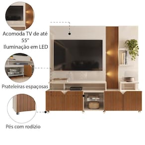 A Estante Home Teather 2,10m Cross acomoda TV de até 55 polegadas e é a escolha certa para você que precisa de um ambiente com melhor organização. Feita com materiais de qualidade, possui detalhe ripado em impressão 3D, 4 portas articuladas com amplo espaço interno, prateleiras para acomodar objetos de decorações, fitas de LED ocultas nas laterais, proporcionando design moderno para dar aquele toque especial na hora de assistir um filme em família e pés em rodízios que facilitam o deslocamento, trazendo praticidade.