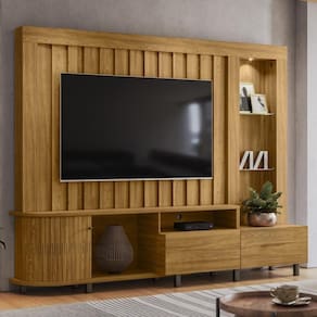 A Estante Home Theater Le Mans é ideal para quem busca qualidade e design, com materiais duráveis e acabamentos modernos, ela combina praticidade e beleza, oferecendo suporte para TVs de até 70 e diversos detalhes que agregam estilo, como portas íveis em MDF, puxadores de poliestireno e iluminação LED integrada. Além disso, o design inteligente com prateleira de vidro e gavetas com corrediças telescópicas garante praticidade e organização.