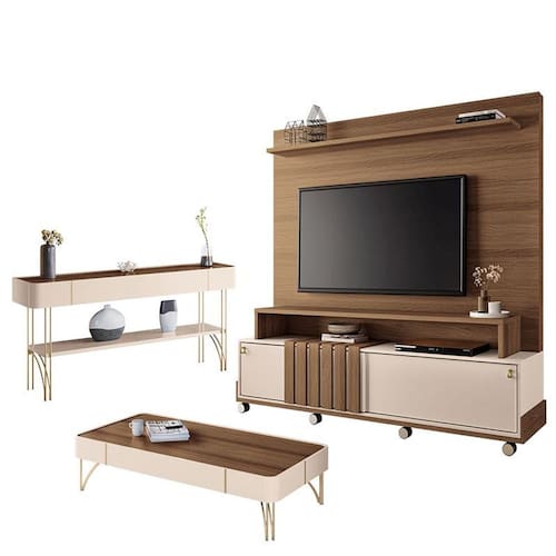 Estante Home Theater Bold e Aparador Vivant e Mesa de Centro Cadenza Castanho Off White – HB Móveis