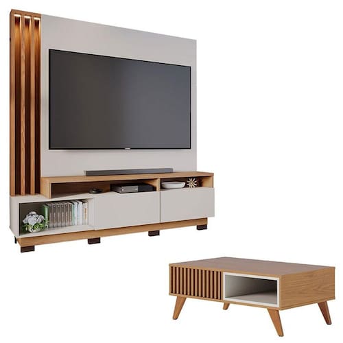 Apresentamos este conjunto de Estante Home Theater Humaitá Com Pés e Mesa de Centro Jeri, fabricados pela Colibri. A estante possui detalhe ripado em sua lateral iluminados por canaleta em led dando um toque aconchegante e elegante para seu ambiente, três nichos para você colocar seus aparelhos eletrônicos objetos decorativos, acompanha 08 pés de plástico e duas portas basculantes equipadas com pistão a gás são ideais para armazenagem e organização. A mesa possui um ambiente minimalista e deseja elegância e modernidade, ela conta com detalhe ripado artesanal, nichos interno em dois lados de forma espelhada e pés em madeira maciça. Una praticidade, funcionalidade e estilo para seu ambiente! Garanta já o seu!