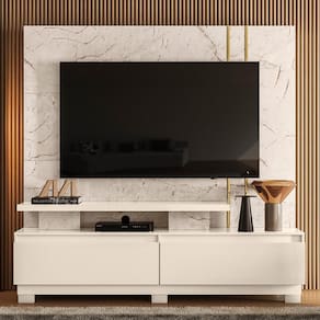ESPECIFICAÇÕES: Estrutura em MDP Pintura UV 2 Gavetas Corrediças telescópicas Perfis com acabamento em hot stamping Acompanha pés Ideal para TV até 75