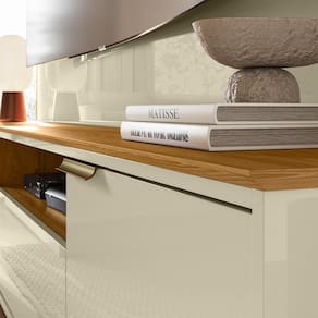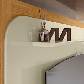 A Estante Home Theater Nilo traz sofisticação e funcionalidade para a sua sala. Produzida em MDP com pintura UV, possui painel com detalhes curvos que valorizam o design. Conta com 2 portas com dobradiças metálicas, 1 gaveta com corrediças telescópicas e puxadores em bronze que agregam elegância. O tampo e a prateleira superior têm borda frontal chanfrada, garantindo um acabamento refinado. Acompanha rodízios e é ideal para TV até 75. Uma opção perfeita para quem busca beleza e praticidade em um só móvel.