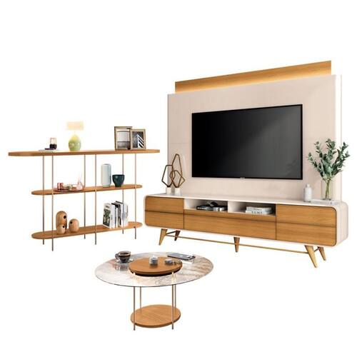 Estante Home Theater Nobre Off White Cinamomo e Aparador Infinity e Mesa de Centro Sky com Tampo de Vidro Cinamomo – HB Móveis