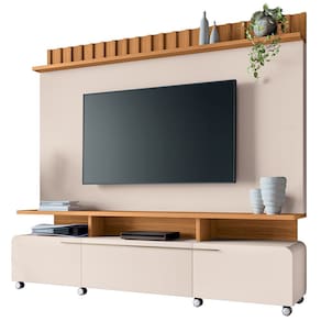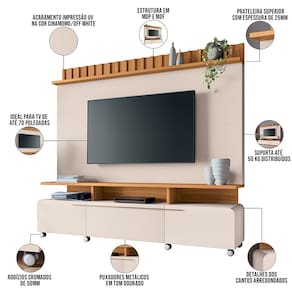 A Estante Home Theater Para TV 70 Pol 200cm Artemis B01 Off White Cinamomo, da Lyam Decor, vai transformar sua sala em um verdadeiro cinema! Com um design moderno e cantos arredondados, essa estante para sala é projetada para TVs de até 70 polegadas, o que deixará seu espaço muito mais imponente. Além disso, toda estrutura é fabricada com materiais de qualidade, e como destaque o tampo e prateleira superior recebem um plus, com espessura de 25mm, garantindo qualidade e durabilidade. Já o detalhe ripado confere um charme especial ao móvel, enquanto os puxadores metálicos em tom dourado adicionam um visual elegante. Para completar, os rodízios cromados de 50mm garantem mobilidade fácil e rápida, tornando essa estante home super versátil.