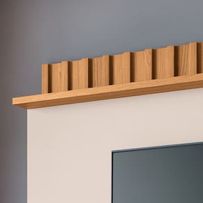 Bancada com cantos arredondados e detalhe ripado na parte superior do painel.