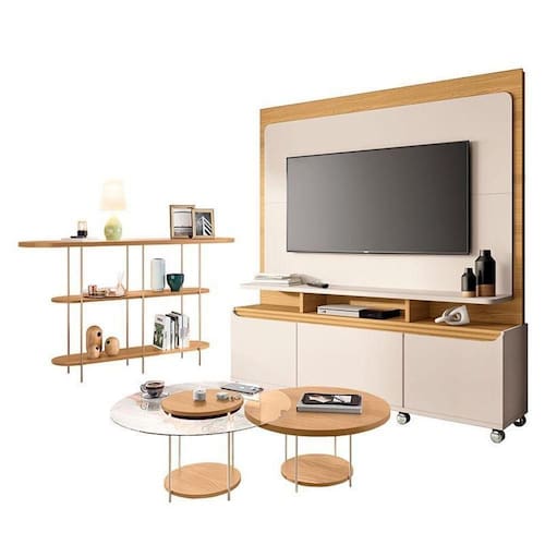 Estante Home Theater Quantum Off White Cinamomo e Aparador Infinity e Kit Mesa de Centro Sky Cinamomo HB Móveis