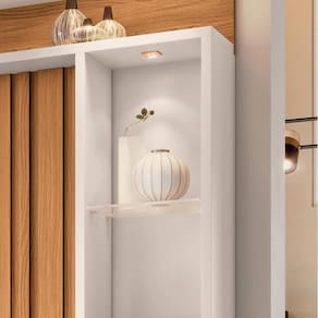 A Estante Home Theater Titan tem um visual marcante com o autêntico ripado, montado em larguras intercaladas. Possui 4 portas com dobradiças laterais e puxadores metálicos em tom dourado, nicho lateral com prateleiras de vidro 6mm, luminária de LED, rodízios cromados de 50mm, produzido em MDP e MDF com espessuras de 40mm, 25mm e 15mm.