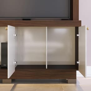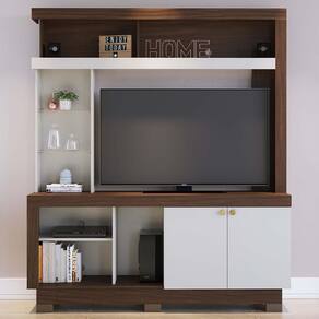 ESPECIFICAÇÕES: Estrutura em MDP Pintura UV 2 Portas Dobradiças metálicas Puxadores pontuais na cor dourado Prateleiras sendo 2 de vidro Nichos Pés de plástico Ideal para TV até 50