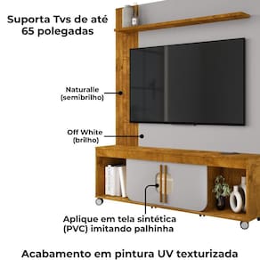 Estante Home Maragogi, design que destaca o ambiente com leveza e funcionalidade. Estrutura em MDP (15/25mm) com acabamento em pintura UV texturizada. Composto por portas de correr com sistema de abertura por trilho plástico, puxadores em MDF, aplique de tela (PVC) que imita palhinha e cantos arredondados. Conta também com frisado decorativo lateral, passa fios, nichos funcionais e suporta TVs de até 65 polegadas com segurança. Este produto será entregue em 2 volumes.