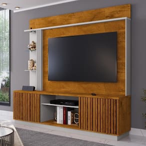 Estante Home Atlanta, design que une funcionalidade e estética em um só móvel. Estrutura em MDP (15/25 mm) com acabamento em pintura UV texturizada. Possui portas basculantes com dobradiças metálicas, prateleiras decorativas (sendo 2 em vidro de 3 mm), nichos abertos, ripados decorativos (MDP 15 mm) e luminária LED inclusa. Conta ainda com rodízios estrategicamente ocultados por rodapés integrados. Suporta TVs de até 65 polegadas com segurança. Este produto será entregue em 2 volumes.